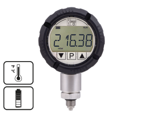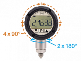 Rango de medición:-1 ... 0 ... +1600 bar Conexión a proceso:Acero Inoxidable Conexión: G¼, G½, ¼" NPT, ½" NPT male, M20x1.5,M16x1.5, M6 Hembra, 7⁄16 UNF Cuerpo:Ø 80 mm Precisión: clase 0.5 ±1 digit Alimentación: Pila de 9 V Características: Pantalla LCD reflectante de 5 dígitos, módulo electrónico giratorio en pasos de 90°, teclas táctiles capacitivos, memoria de pico, medición de temperatura (opcional), unidades de medición seleccionables, función Tara. Opciones: Rangos de medición especiales (bajo demanda) Montaje con diferentes sellos separadores Funda de protectora de goma